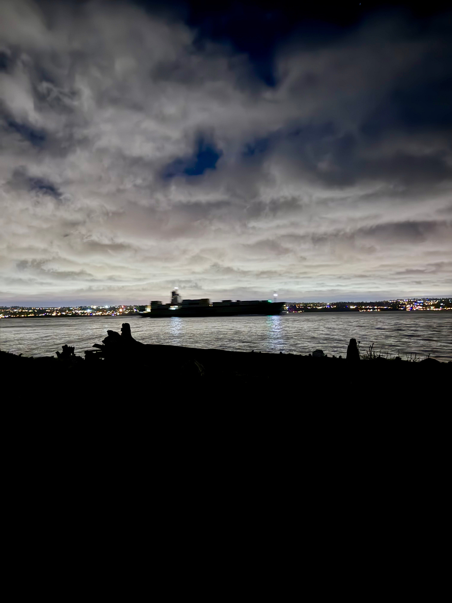 I saw other things, though. I saw seals, their shiny round heads bobbing gently in the whitecaps. I saw but mostly heard a pair of eagles delicately kittering to one another on their morning rounds. I saw cormorants shooting across the surface of the water like oily black arrows. I saw planes circling. A huge ship thrummed past, loaded with cars or air conditioners or cashmere sweaters or industrial gears or instant noodles. I saw no other human beings, but across the water I could see a traffic light flash from green to red, green to red, green to red.