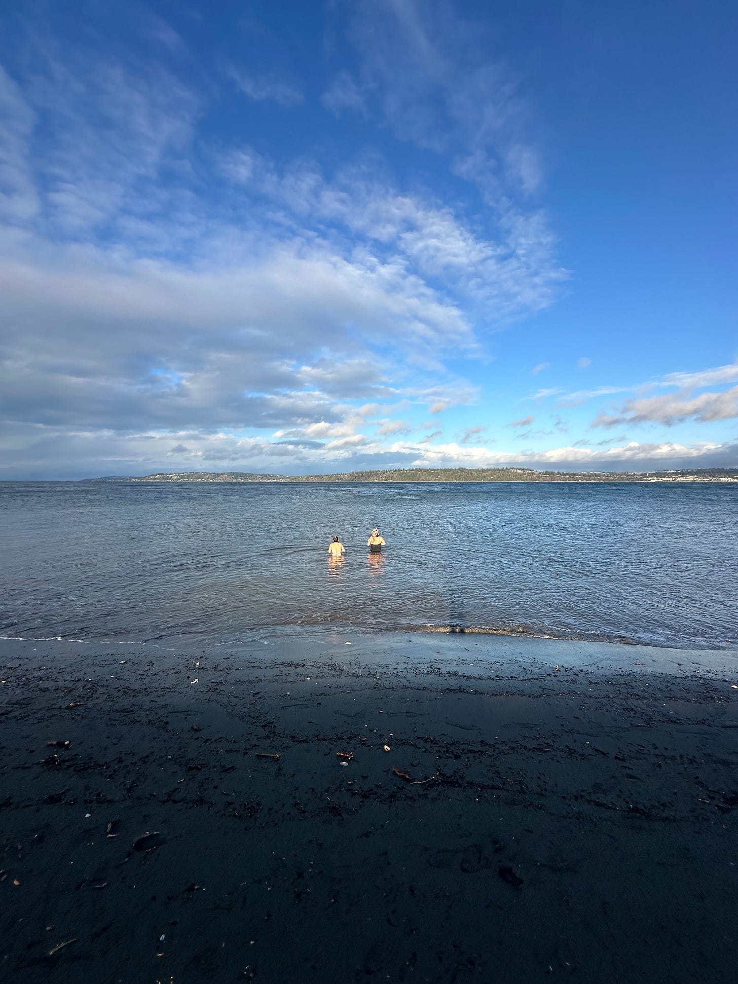 We found a clear-ish spot to dunk, and it was so invigorating we did it again the next day off the sandy side of Point Robinson, little zaps of clarity that cut through too many cookies and glasses of Bordeaux the night before. Both times, of course, I scanned the horizon, feeling that being immersed in the water myself would, through a mysterious property of kinship, summon J Pod. Weren’t their dark, bouncy sides being brushed by the same cold salt, tickled by the same tangles of uprooted alders? And both times, the horizon was empty.